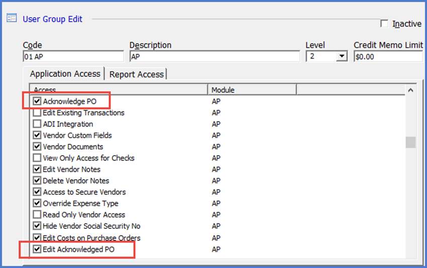 If a User Group is granted this permission, the users in the group will see mark a PO as “Acknowledged”.