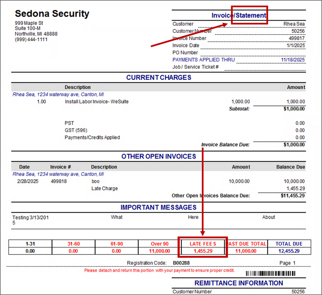 13. Click OK and your invoice will print with the statement detail, including the statement level late fee.