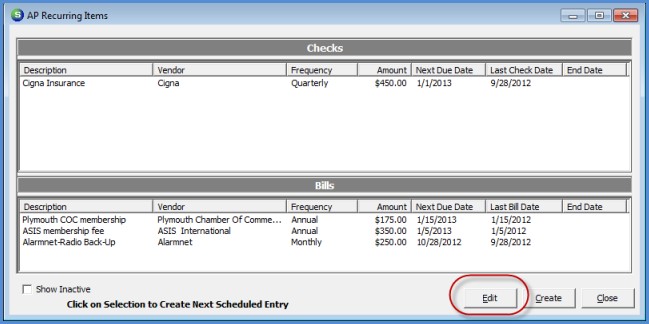 - The Recurring Item form opens. Highlight the Recurring Bill or Recurring Payment to be edited then click the Edit button located at the lower right of the form.