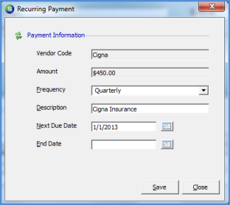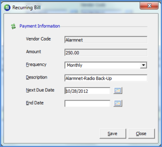If information needs to be changed on the setup of a Recurring Bill or Recurring Payment, you can modify any information except the Vendor Code and the Amount. If the amount needs to be changed, you need to delete the Recurring Item then set up a new Recurring Item with the new amount.