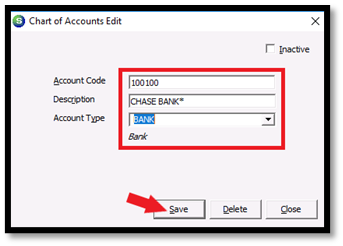 - Fill in the Account Code, Description, and Account Type. Click the Save button when done.