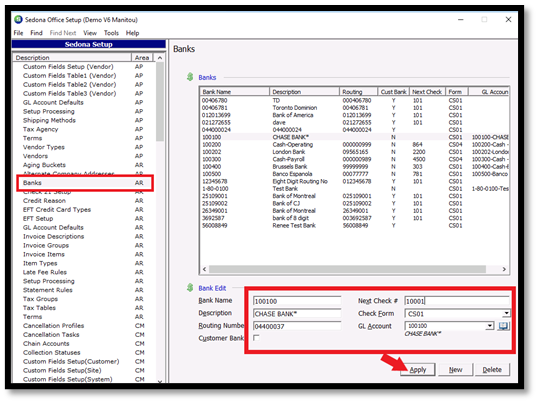 - Find the GL Bank that was just added, and enter the routing number and next check #. Click Apply.