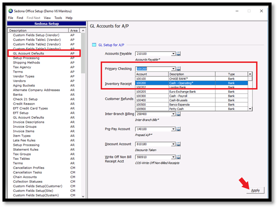 - Still in SedonaSetup, click on GL Account Defaults / AP.