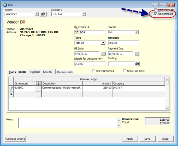 - Once the Bill form is displayed, fill in the required and optional information. Select the Recurring Bill checkbox in the upper right area of the Bills form.
