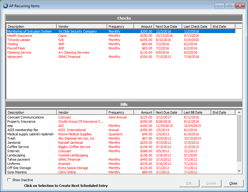 Recurring Bills are used to setup Bills that are paid on a particular frequency. Once the initial recurring bill is created, generate (usually monthly) all the recurring bills. If the bill amount varies each time, such as in the case of a utility bill, the amount may be modified once the recurring bill is generated. These recurring items are viewable from the Recurring Items menu option of the Accounts Payable menu.